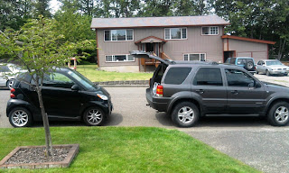 This is a picture of my aunts TINY vehicle parked behind my dads vehicle! The text with this picture from my dad stated, "look my car just gave birth" I laughed so hard!!!
